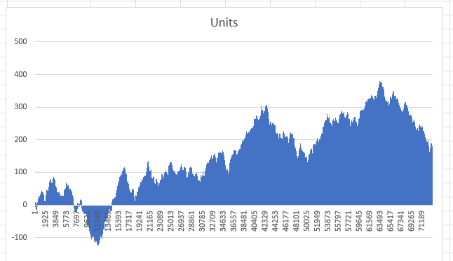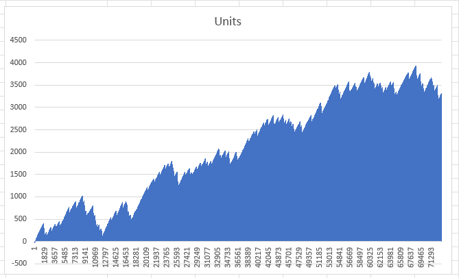 very nicely increasing profit chart with a very small drawdown. If the maximum placed bet of 99 units is still too agressive, there is milder version of this with the following stats and chart: